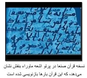 اینکه آیات قرآنهای اولیه در طول زمان بارها مورد بازنگری قرار گرفته و چندین بار بازنویسی گردیدهاند، امری است که از طریق آزمایشهای نسخههای اولیه ـ نسخههای “صَنعا”، “برلین” و “پاریس”، که عمرشان طولانی تر از دوران حیات ادعایی محمد میباشد ـ تحت پرتو اشعههای ماوراء بنفش به اثبات رسیدهاست.